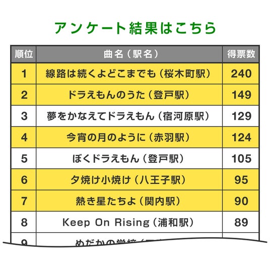 2025年6月、TRAINIART公式LINEで、友だち会員の皆さまを対象に、「玩具に収録してほしいJR 東日本のご当地の発車メロディ」をテーマとしたアンケート調査を実施し、535名の方から ご回答をいただきました。アンケート結果を参考に、採用路線とアニメ曲・童謡・J-POPなどの楽曲のバランスを考慮し、投票数の多かった駅の発車メロディ5曲を本商品に収録しています。