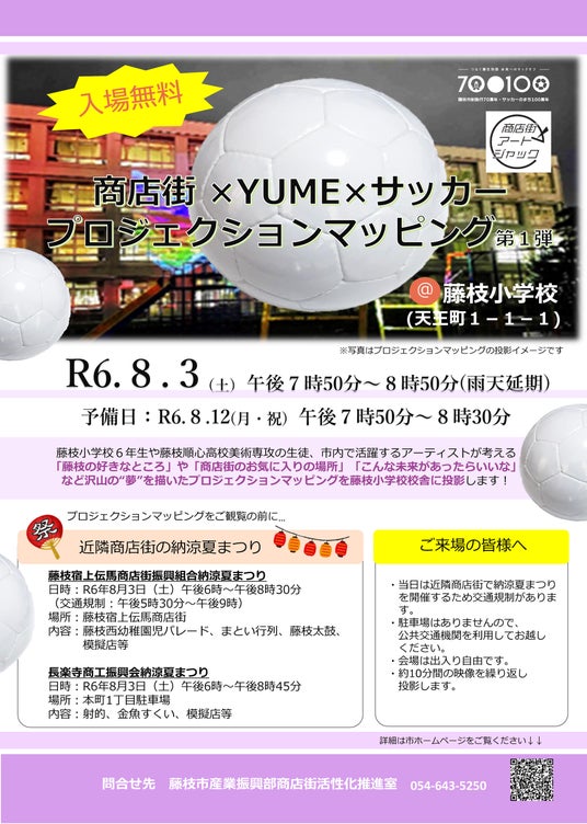 第3弾として、藤枝小学校6年生や藤枝順心高校美術専攻の生徒、市内で活躍するアーティストが考える「藤枝の好きなところ」や「商店街のお気に入りの場所」「こんな未来があったらいいな」など沢山の“夢”を描いたプロジェクションマッピングを藤枝小学校校舎に投影します。
