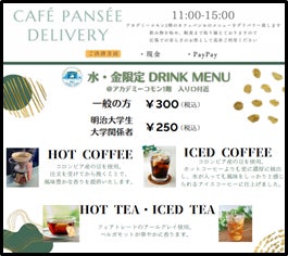 都心型キャンパスである駿河台キャンパスに「滞在するだけで楽しめ、歩けばウキウキする広場を作ろう!」ということを目的として、オープンスペースへのピアノの設置に加え、カフェパンセの協力のもと、明大生がハンドドリップで抽出したコーヒーの販売も行われています。さらに、ベンチや人工芝などを設置し、多くの人が滞在できるような環境づくりが行われています。