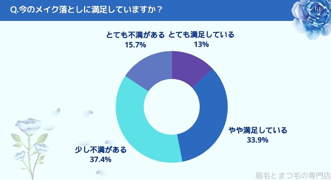 今のメイク落としに満足しているかお聞きしたところ「とても満足している(13%)」、「やや満足している(33.9%)」、「少し不満がある(37.4%)」、「とても不満がある(15.7%)」という結果になりました。