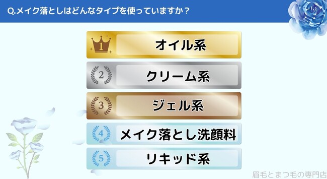 どんなタイプのメイク落としを使っているかお聞きしたところ「1位>オイル系」、「2位>クリーム系」、「3位>ジェル系」、「4位>メイク落とし洗顔料」、「5位>リキッド系」という結果になりました。