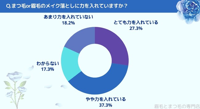 まつ毛or眉毛のメイク落としに力を入れているかお聞きしたところ「とても力を入れている(27.3%)」、「やや力を入れている(37.3%)」、「わからない(17.3%)」、「あまり力を入れていない(18.2%)」という結果になりました。
