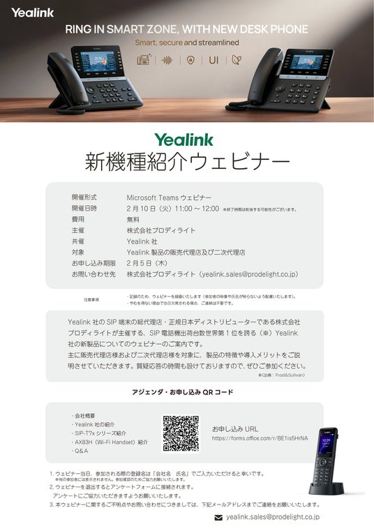 電話のDXを推進する株式会社プロディライト(大阪市中央区:代表取締役社長 小南 秀光、証券コード:5580、以下プロディライト)は、2026年2月10日(火)に、Yealink社の新製品についてのウェビナーを開催することをお知らせいたします。