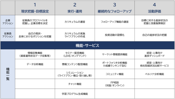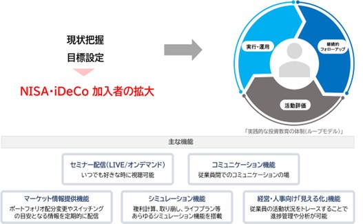 実践的な金融経済教育の体制構築については、金融庁が2022事務年度金融行政方針のひとつとして発表した『社会課題解決による新たな成⾧が国民に還元される金融システムを構築する』ための施策として掲げられた、国民の安定的な資産形成を実現する金融リテラシーの向上に向けた金融経済教育に対応するもので、「NISAの抜本的拡充、金融経済教育の推進、顧客本位の業務運営」といったテーマに基づき、職域の金融経済教育の推進を具現化することを通して「資産所得倍増プラン」へ賛同する企業並びに経済団体等に対し、本デジタルプラットフォームをASP型サービスプラットフォームとして提供いたします。