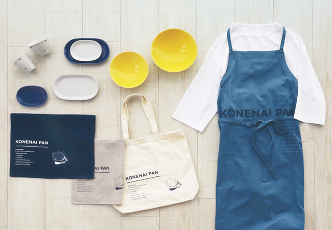 キッチンクロスやトートバッグ、ユニセックスで使えるエプロンに、栗原はるみの人気レシピ「こねないパン」のプリントシリーズが新登場!