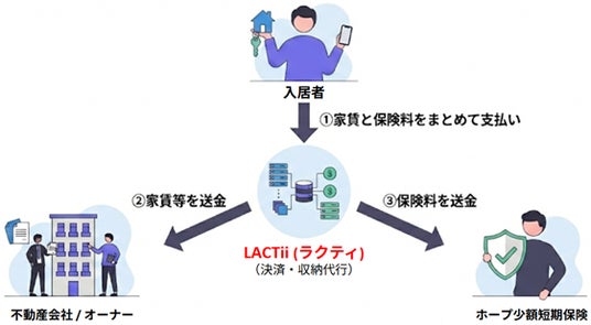 この度の提携により、エルズサポートが提供する「LACTii(ラクティ)」を活用し、賃貸借契約における家賃等と併せて、ホープの家財保険料を一括して収納代行を行うスキームを構築いたしました。これにより、入居者は家賃と保険料を合算して支払うことが可能となり、支払いの利便性が向上します。また同時に、保険料未払いによる意図しない解約(付保漏れ)を未然に防ぐことができ、オーナー・管理会社にとっても、無保険リスクの解消による安心・安全な賃貸経営が実現します。さらに、収納・送金業務が自動化されることで、関係各社の事務工数削減といったDX効果も創出いたします。