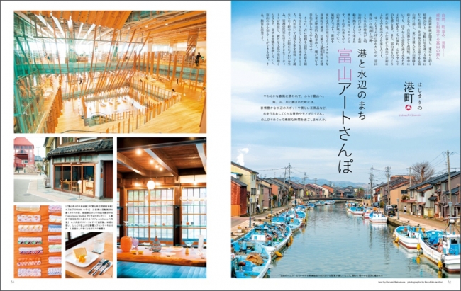 神戸ではファッション、パンに異国情緒めぐり。門司港では雑貨やカフェ、レトロ建築をカメラを持って歩く旅。富山ではとりわけ水に親しめる新湊、岩瀬に注目。新湊は内川沿いのノスタルジックな古い家屋と、新鮮な魚介類、個性あふれる橋や防波堤に絵画が並ぶ「内川アート」といった見所にあふれ、港町岩瀬は富岩運河環水公園にクラフト文化、歴史ある建物が魅力。