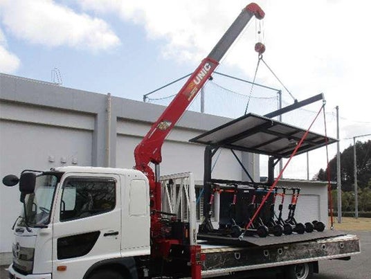 4トンユニック車なら約20分で設置完了し、設置後は油圧ジャッキや台車でも移動できます。