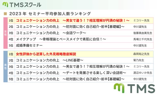 「TMSスクール」とは、婚活総合カンパニーTMSグループが提供する成婚メソッドの1つです。婚活のスキルアップにつなげるセミナーのご提供だけでなく、自分自身の活動の傾向を数値化し、客観的にうまくいっている点・課題を把握できたうえで、課題に特化したセミナーを選択できるため、効率的かつよりよい活動ができるようにサービス提供を開始しました。TMSグループの直営結婚相談所である「フィオーレ」や「TMSパートナー」、TMS(全国結婚相談事業者連盟)に加盟する全国の結婚相談所にて利用できます。