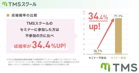 昨年度同様、「TMSスクール」を利用できる結婚相談所の1つである「フィオーレ」にて、2023年のサービス利用者と非利用者の成婚確率を比較集計したところ、サービス利用者の成婚する確率が非利用者に対して34.4%と前回の29.9%を上回る結果となりました。