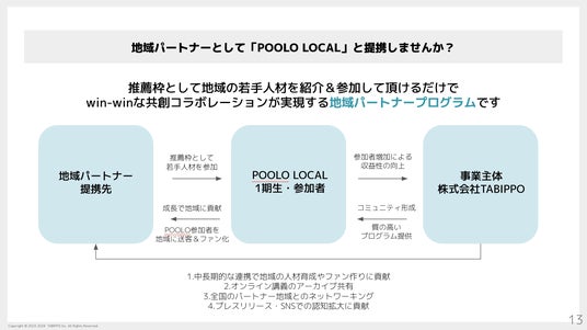 株式会社TABIPPOは、「あたらしい旅で自分と世界の豊かさをつくる」をミッションとした、「POOLO(ポーロ)」の新コース「POOLO LOCAL 1期」と連携する地域パートナーを募集します。