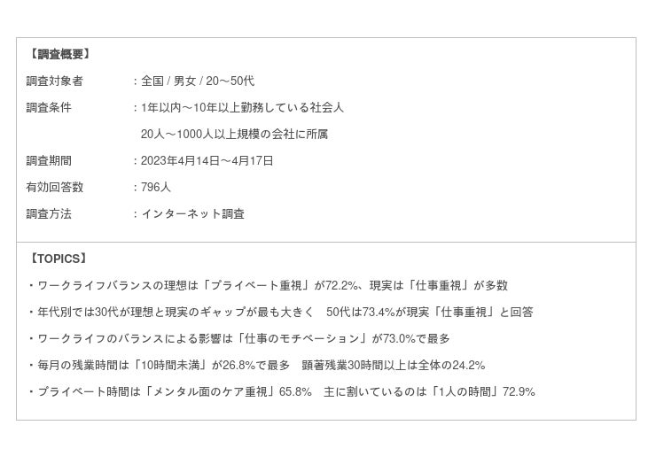 そこでJob総研では、年代別を含めたワークライフバランスの理想と現実のギャップや、ワークライフバランスが与える影響、また働き方別に見る毎月の残業時間と、プライベートの時間に重視することなどを調査した「2023年 ワークライフ実態調査」を実施しました。