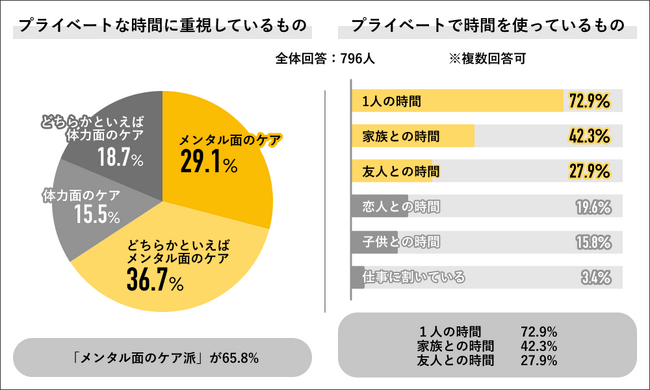 また、プライベート時間に主に使っている時間を聞くと、「1人の時間」が72.9%で最多回答になり、次いで「家族との時間」が42.3%、「友人との時間」が27.9%、「恋人との時間」が19.6%、「子供との時間」が15.8%、「仕事に割いている」が3.4%の結果になりました。