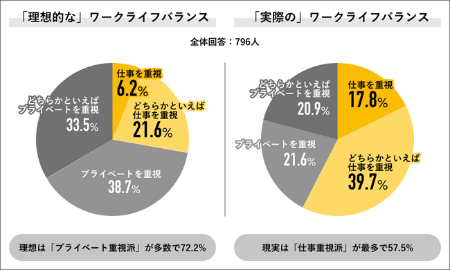 回答者全体の796人にワークライフバランスの理想を聞くと、「プライベートを重視」38.7%、「どちらかといえばプライベートを重視」33.5%を合算した72.2%が”プライベート重視派”の回答をしました。”仕事重視”は27.8%で、内訳は「仕事を重視」が6.2%で、「どちらかといえば仕事を重視」が21.6%でした。