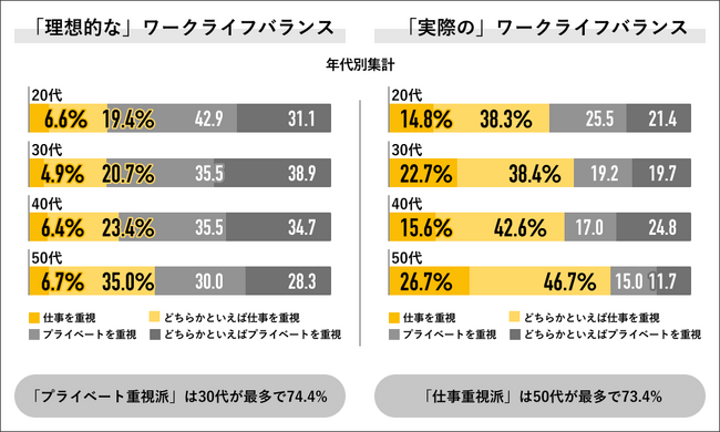 ワークライフバランスの理想と現実を年代別に見ていくと、”プライベート重視派”の回答は、20代が74.0%、30代が74.4%、40代が70.2%、50代が58.3%になり、30代が最もプライベート重視を理想としている結果になりました。一方実際のワークライフバランスでは、全年代で “仕事重視派“が過半数を上回る結果になり、理想と現実に大きなギャップがある結果になりました。また”プライベート重視派”の回答では20代が46.9%、30代が38.9%、40代が41.8%、50代が26.7%の結果になり、理想と現実で比較すると、30代の35.5%のギャップが最も開きのある結果になりました。