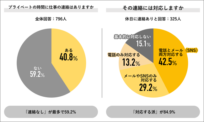 回答者全体の796人にプライベートの時間に仕事上の連絡有無を聞くと、「ある」が40.8%で「ない」が59.2%でした。また「ある」を回答した325人にその連絡に対応するか否かを聞くと、「電話もメール(SNS)も両方対応する」が42.5%で最多になり、次いで「メールやSNSのみ対応する」が29.2%、「基本的に対応しない」が15.1%、「電話のみ対応する」が13.2%の結果になりました。