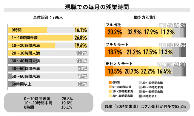 またこれを働き方別で見ていくと、残業時間が「30時間未満」の回答は「フル出社」の回答者が最多で82.2%になり、「30時間以上」の回答は「フルリモート」の回答者が最多の31.3%の結果になりました。