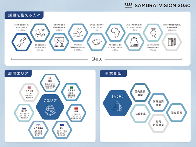 様々な課題がある中、当社として、より解決したい課題を抱える9カテゴリー約9億人の人々にフォーカスいたします。そして、その課題を解決するために「国内投資」「海外投資」「共創事業」「社内新規事業」「独立起業」を通じて1500の事業創出を支援していくことを定めました。また展開エリアは、現在の4エリアから7エリアへ拡大し、「日本」「イスラエル」「アフリカ」「中国」に加えて「アメリカ」「ロシア」「EU」にて展開いたします。これら7エリアの国々の強みを活かし掛け合わせて連携することで、スピード感を持ち課題解決に取り組んでいきます。
