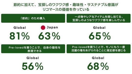 Pre-lovedの選択は、節約だけが理由ではありません。他の情緒的な価値によって、リコマースは楽しまれています。eBayの調査では、世界の消費者の65%が、一点物やレアなアイテムを探し当てる、宝探しのようなワクワク感を楽しんでいます。また、56%が「Pre-lovedを買うことで、自身の個性を表現できる」と回答しており、リコマースそのものを趣味とする文化があります。さらに、68%が、「Pre-lovedを買うことで、モノにもう一度活躍の場をあげられることに満足感を感じる」と回答しており、廃棄を減らしてモノを大切に使い継ぐというサステナブルな行動が生まれています。単なる安価な代替品探しではなく、自身のスタイルや趣味、サステナブル意識などを追求する手段としてもリコマースが選ばれています。
