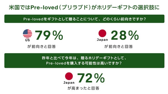 ホリデーシーズンにおけるギフト選びに変化が現れています。特にリコマース文化が先行する米国では、eBayの調査で79%が「Pre-loved(プリラブド、中古品の新しい呼び方、前の所有者に大切にされていた品)を贈り物として贈る可能性がある」と回答しており、贈り物は新品でなければならないという固定観念は過去のものとなりつつあります。日本においては28%にとどまっていますが、72%が「昨年と比較して、Pre-lovedを贈り物として選ぶ可能性が高まった」と回答しており、ユニークな一点物や価値あるヴィンテージ品を贈る価値観が、今後新たな選択肢として日本に広がる余地を示しています。