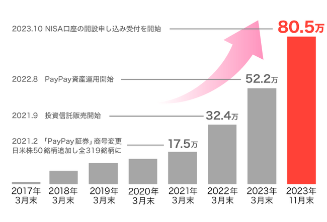 PayPay証券株式会社(東京都千代田区、代表取締役社長:番所 健児、以下PayPay証券)は、2023年11月末時点の開設口座数が、2023年3月末時点と比較し1.5倍以上となる(※1)80万口座を突破しましたことをお知らせします。