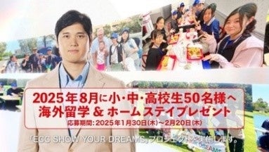 総合教育・生涯学習機関の株式会社ECC(本社:大阪市北区、代表取締役社長:花房雅博)は、2024年8月に実施した『SHOW YOUR DREAMS 2024』に続き、ECCブランドアンバサダーの大谷翔平選手との共同プロジェクト第2弾となる『ECC SHOW YOUR DREAMS 2025』を実施することを発表いたします。2024年12月17日(火)より応募者登録を開始し、2025年1月30日(木)からは一次選考応募を開始いたします。