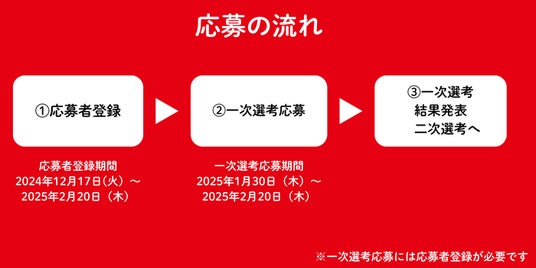 応募方法:応募者登録後、2025年1月30日(木)に送付される一次選考応募フォームより、必要情報をご提出のうえ、ご応募ください。