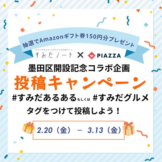 墨田区内で暮らしている方、よく訪れる方ならきっと共感できる「#すみだあるある」、墨田区ならではの名物料理や地元住民おすすめの「#すみだグルメ」をピアッザで募集します。投稿いただいた内容の一部は、『すみだノート』6月号(予定)や『すみだノート』Webサイトにてご紹介します。
