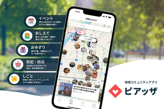 地域コミュニティアプリ「ピアッザ」は、同じ地域で暮らす人々が集まり、地域の情報交換や不要品の譲り合い等を通じて、自然な交流や助け合い、新たなつながりが生まれる地域プラットフォームです。