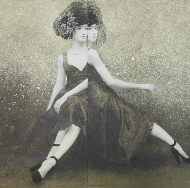 二川氏は、FACE展2014 損保ジャパン美術賞展に人物画「秒差ニ態」を出品し、優秀賞を受賞しました。これが大きな転機となり、近年は人物画の制作に力を入れています。「秒差ニ態」は、時間を僅かにずらして描かれた二枚の女性像がひとつの平面作品としてまとめられた、全く新しい形態の作品です。しかし、時間の経過を同じ平面上で表す、という屏風や巻物のような日本の伝統的な表現にも通じ、まさに伝統を踏まえた研鑽の蓄積の上に新しいアイデアを加えて生まれた現代的表現といえるでしょう。また、墨と紙の白だけで人物の立体感や質感を見事に表す高い技術にもご注目ください。