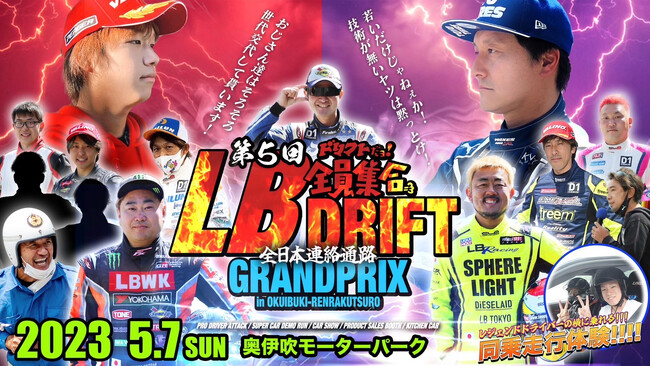 5月7日(日)に「”ドリフトだヨ全員集合” LB DRIFT GRANDPRIX 第5回 全日本連絡通路 in 奥伊吹モーターパーク」が開催され、イベントには国内トップレベルのドライバイー(ギャラクシー横井(横井昌志)、川畑真人、斎藤大吾、日比野哲也、田中省己、濱田清文)が参加して、奥伊吹モーターパークの名物コースの一つ「奥伊吹連絡通路」でスーパードリフトバトルを繰り広げます。
