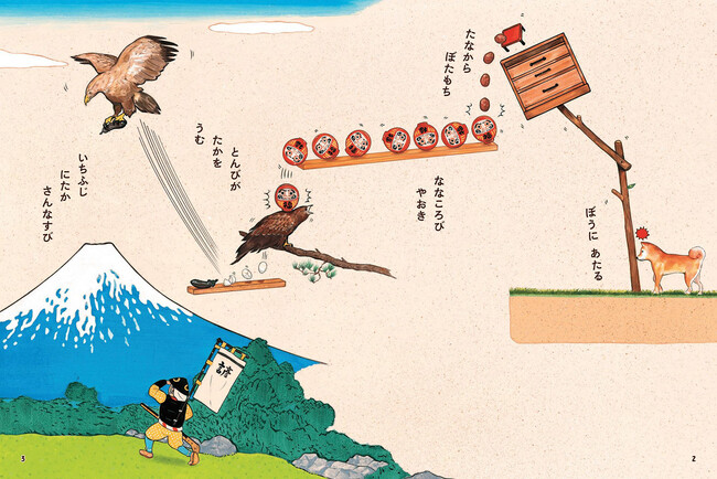 「下手な鉄砲も数うちゃあたる」で、鉄砲がタカにあたり、タカがもっていたなすびが、猿にあたり「猿も木から落ちる」とつながっていき……