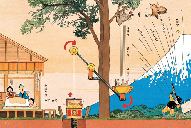 今回は、大串ゆうじさんならではのギミックとことわざが出会った、新感覚の絵本。50のことわざや慣用句が、ユニークなイラストでつながっていきます。