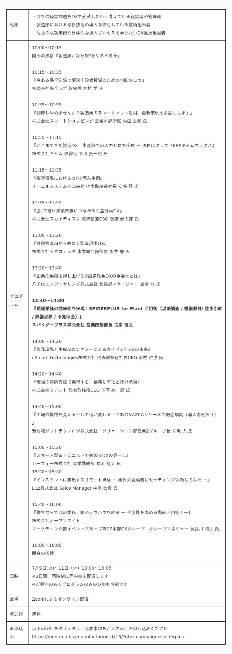建設DXサービス「SPIDERPLUS」を開発提供するスパイダープラス株式会社は、2024年7月9日(火)~11日(木)に八千代エンジニヤリング株式会社が開催するオンラインカンファレンス『「製造業に、新しい解を。」15の最新技術と事例で学ぶ製造業DXの可能性』に、スパイダープラス株式会社 営業四部 部長 古家信之が登壇することをお知らせいたします。