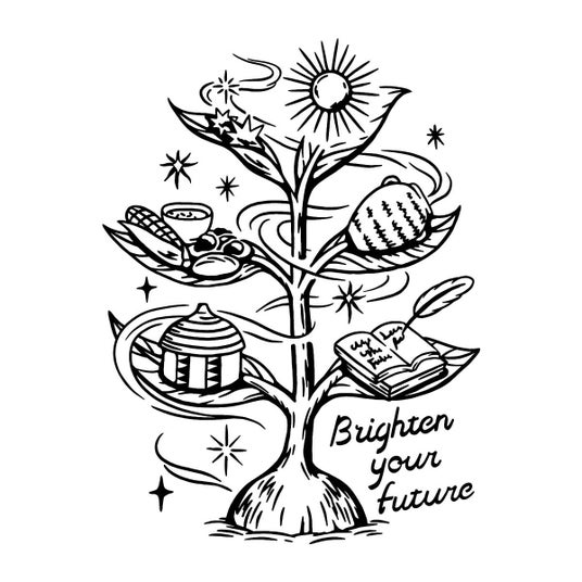 太陽に向かって伸びる若い木の葉っぱの上に、教育を表すノートとペンや、活動地で一般的な家や食べもの、共有の文化を表す水瓶を描き、さまざまな可能性の種が育って花開き、将来を明るくする(Brighten your future)様子を表現しました。