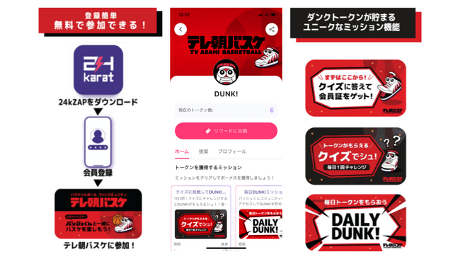 本サービスは、24kZAPが可能にするユニークな体験を利用して、参加者とバスケットボールの多彩なタッチポイントを提供します。参加者は楽しみながらにコミュニティ内で活用できる「ダンクトークン」(サービス内ポイント)を貯めることが出来ます。貯まったダンクトークンはテレ朝バスケ公式マスコット「バッシュくん」のデジタルアイテムなどと交換することが可能です。