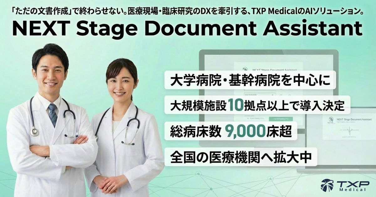 TXP Medical株式会社(本社:東京都千代田区、代表取締役:園生 智弘、以下TXP Medical)は、生成AIを活用した医療文書作成支援システム「NEXT Stage Document Assistant(以下、NSDA)」において、提供開始から短期間で、大学病院および地域基幹病院を中心とした合計11の施設(すべて500床以上の大病院)での導入・運用が決定したことをお知らせいたします。
