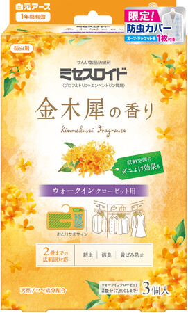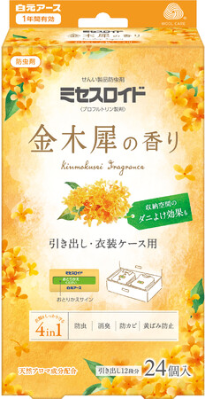 そこで今回、『ミセスロイド 金木犀の香り』を数量限定で発売いたします。道端でふわっと香る、甘くて心地よい金木犀の香りが収納空間に広がり、衣類をやさしく包む芳香タイプの衣類用防虫剤です。また、大切な衣類を守る「防虫」「消臭」「防カビ」「黄ばみ防止」の4つの機能と、「収納空間のダニよけ効果※」を搭載した多機能タイプとなっています。パッケージは金木犀の良い香りを想起させるノスタルジックな雰囲気のデザインを採用しました。ラインナップは「引き出し用」「クローゼット・洋服ダンス用」「ウォークインクローゼット用」の3種類で展開します。*ウォークインクローゼット用は防虫、消臭、黄ばみ防止、収納空間のダニよけ効果つきとなります