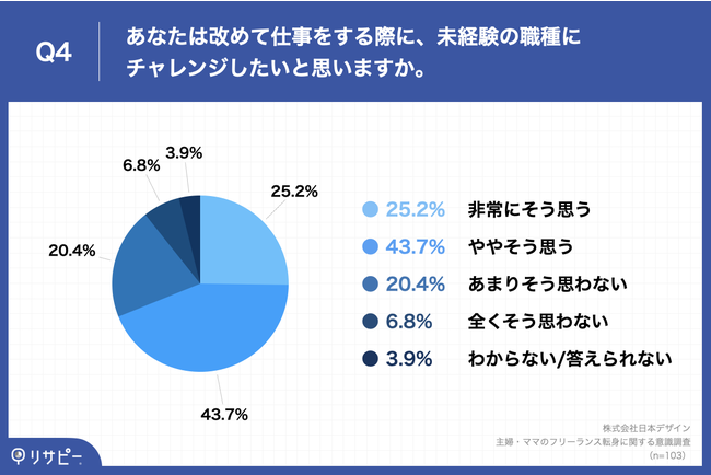 「Q4.あなたは改めて仕事をする際に、未経験の職種にチャレンジしたいと思いますか。」(n=103)と質問したところ、「非常にそう思う」が25.2%、「ややそう思う」が43.7%という回答となりました。