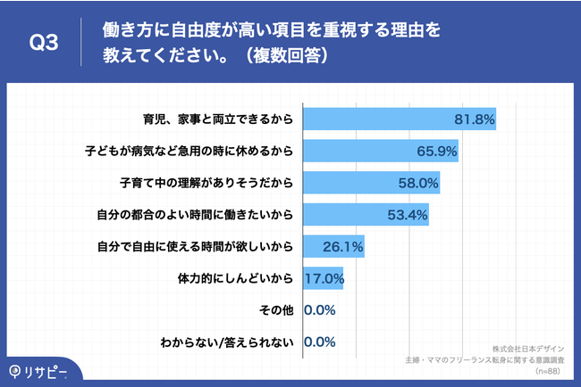 Q1で「労働時間が柔軟か」「融通のきく勤務体制か」を回答した方に、「Q3.働き方に自由度が高い項目を重視する理由を教えてください。(複数回答)」(n=88)と質問したところ、「育児、家事と両立できるから」が81.8%、「子どもが病気など急用の時に休めるから」が65.9%、「子育て中の理解がありそうだから」が58.0%という回答となりました。