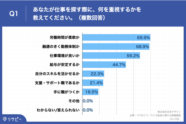 「Q1.あなたが仕事を探す際に、何を重視するかを教えてください。(複数回答)」(n=103)と質問したところ、「労働時間が柔軟か」が69.9%、「融通のきく勤務体制か」が68.9%、「仕事環境が良いか」が59.2%という回答となりました。