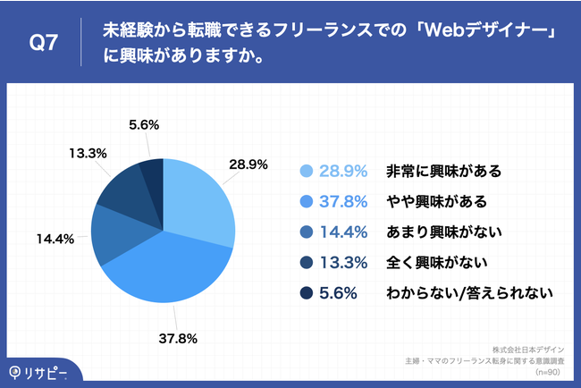 Q6で「非常にそう思う」「ややそう思う」と回答した方に、「Q7.未経験から転職できるフリーランスでの「Webデザイナー」に興味がありますか。」(n=90)と質問したところ、「非常に興味がある」が28.9%、「やや興味がある」が37.8%という回答となりました。