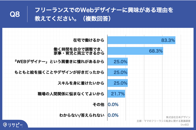 Q7で「非常にそう思う」「ややそう思う」と回答した方に、「Q8.フリーランスでのWebデザイナーに興味がある理由を教えてください。(複数回答)」(n=60)と質問したところ、「在宅で働けるから」が83.3%、「働く時間を自分で調整でき、家事・育児と両立できるから」が68.3%という回答となりました。