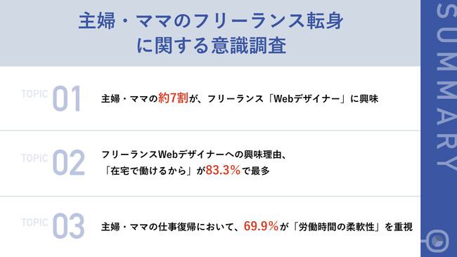 株式会社日本デザイン(本社:東京都池袋、代表:大坪拓摩(おおつぼ・たくま))が運営するゼロイチWEBデザインスクール「デザスク」(https://japan-design.jp/design-school)は、仕事復帰予定がある元IT企業勤務の主婦・ママ103名を対象に、主婦・ママのフリーランス転身に関する意識調査を実施いたしましたので、お知らせいたします。