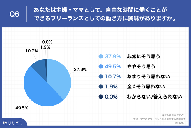 「Q6.あなたは主婦・ママとして、自由な時間に働くことができるフリーランスとしての働き方に興味がありますか。」(n=103)と質問したところ、「非常にそう思う」が37.9%、「ややそう思う」が49.5%という回答となりました。
