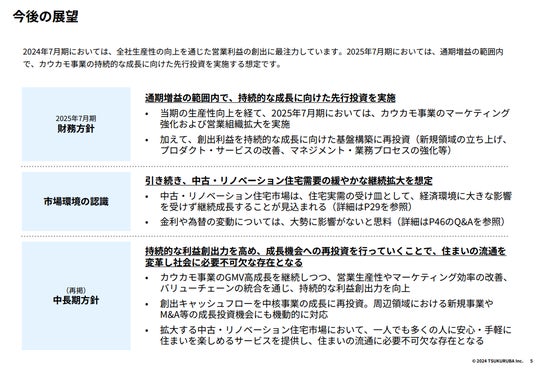 2024年7月期においては、全社生産性の向上を通じた営業利益の創出に最注力しています。2025年7月期においては、カウカモ事業のマーケティング強化および営業組織拡大を通じた事業拡大に注力します。 創出した利益を、通期増益の範囲内で、持続的な成長に向けた基盤構築に再投資する想定です。具体的には、新規領域の立ち上げ、プロダクト・サービスの改善、マネジメント・業務プロセスの強化などへの投資を行います。