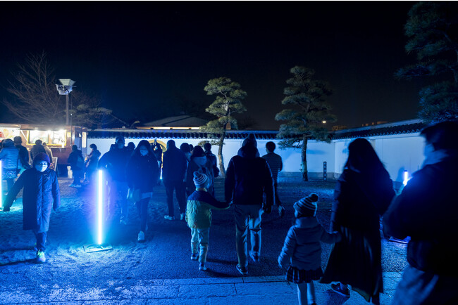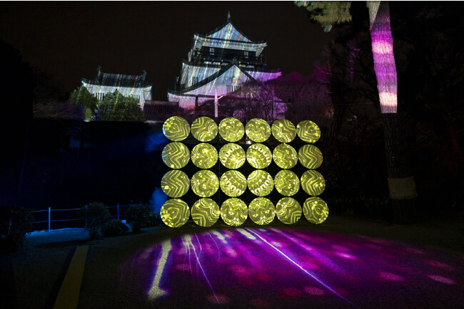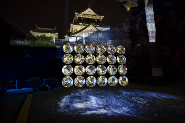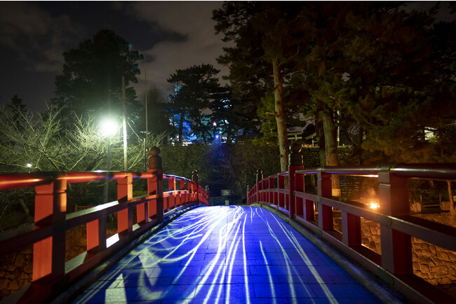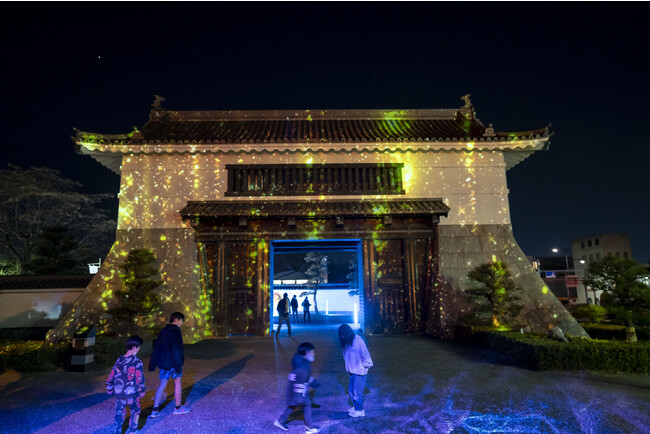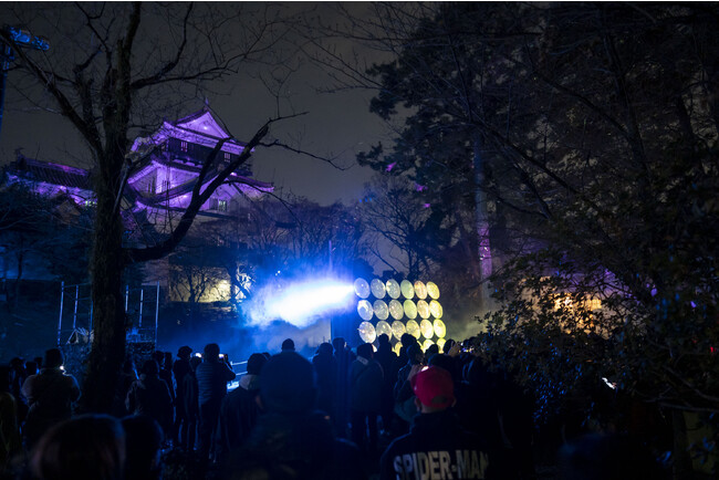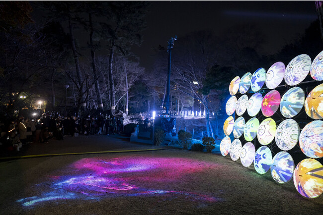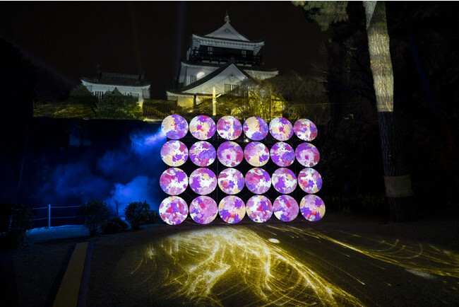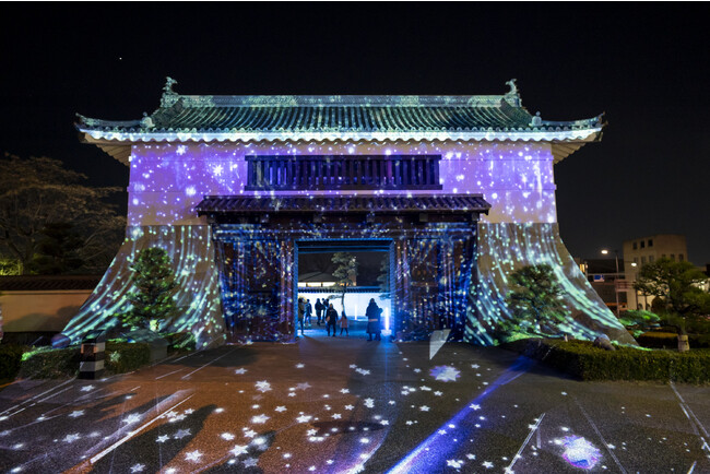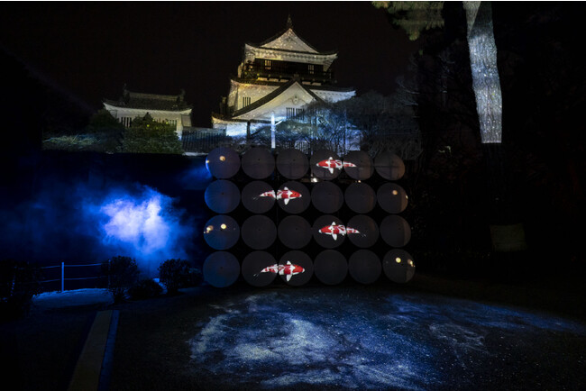 【内容】 徳川家康生誕の地・岡崎城の清海堀沿い約60mにわたる長さ2mのLEDバー39本による光と音の演出と、和傘を組み合わせた幅約6メートル・高さ約4メートルのスクリーンに投影した和柄や冬をモチーフとしたプロジェクションマッピング映像が連動。幻想的な光の空間を創出したほか、岡崎城大手門では華やかなプロジェクションマッピング映像の投影とともに地面に人の動きに反応して映像が変化するインタラクティブコンテンツを投影するなど、岡崎公園内のさまざまなスポットをデジタルライトアップで彩りました。