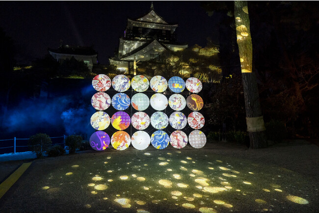 徳川家康生誕の地・岡崎城で、和傘を組み合わせた幅約6メートル・高さ約4メートルのスクリーンに伝統的な和柄をモチーフにした鮮やかなデジタルアートのプロジェクションマッピング映像を投影。