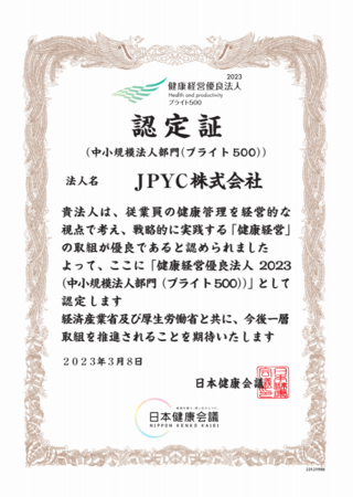 2023年度に中小規模法人部門で選定された14,012法人の中で、さらに上位500の法人は「ブライト500」とされており、JPYC株式会社はこの「ブライト500」にも認定されております。また、中小規模法人のブライト500認定取得は、協会けんぽの東京支部での被保険者の中では金融業で唯一の取得になります。