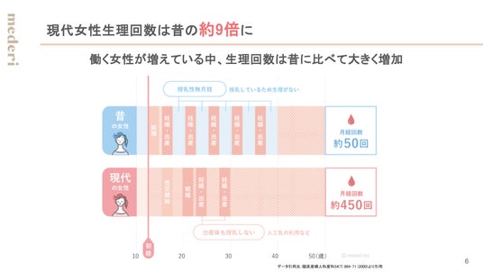 かつては早期に妊娠・出産を経験し、授乳期間中は生理が訪れなかったため、女性の生理回数は少なかった一方、現代女性は晩婚化・出産回数の減少により生理の回数が増加。その結果、女性の体自体は変わっていないにもかかわらず、苦痛を感じる回数が増えている現状を指摘しました。